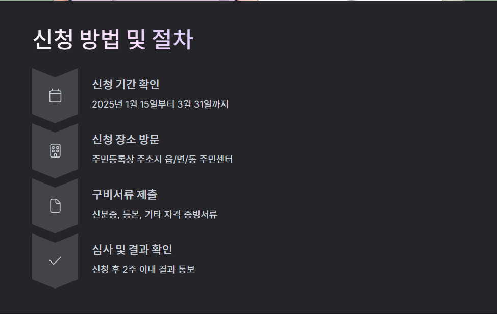 - 신청 장소: 주민등록상 거주지 관할 읍·면·동 주민센터