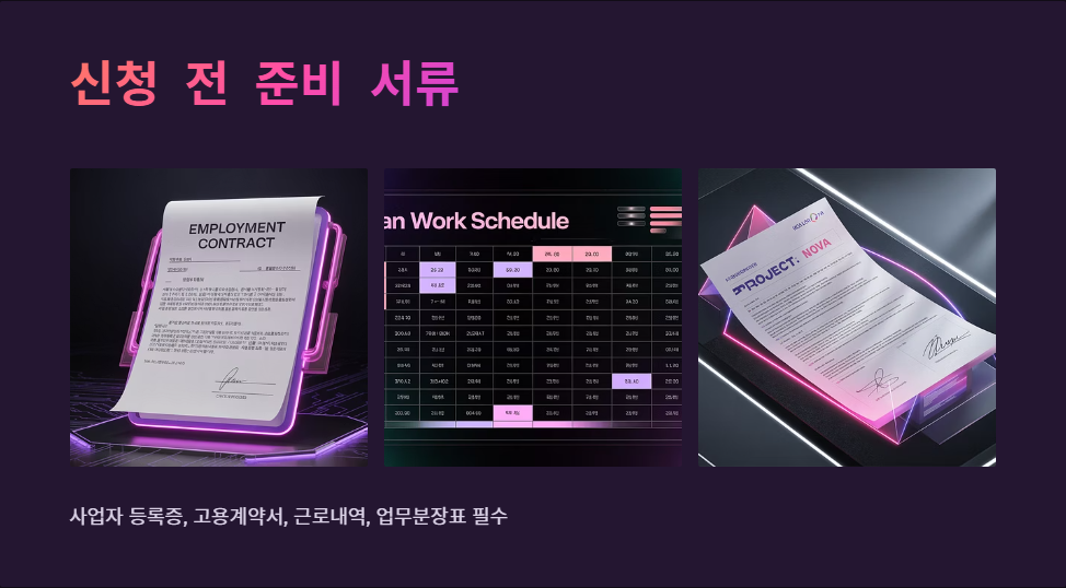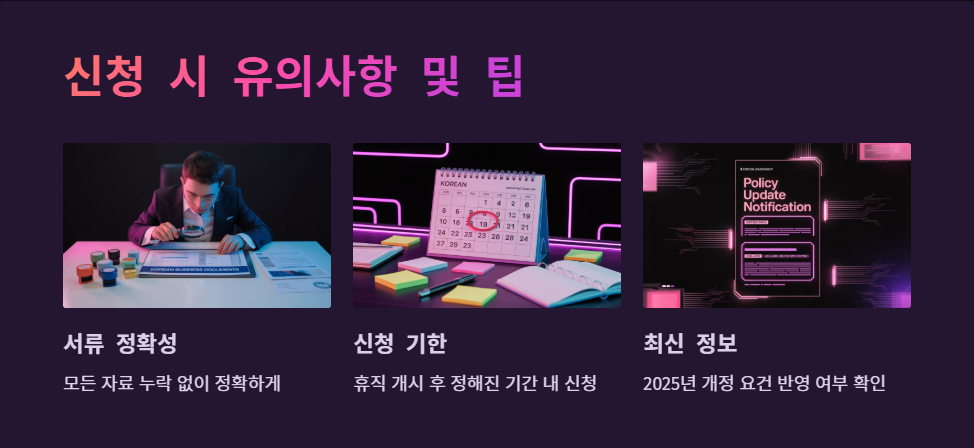 - 정확한 정보 입력: 신청서에 기재하는 정보는 사업자등록증, 근로계약서 등 공식 문서와 일치해야 합니다. 오타나 잘못된 정보는 심사 지연 또는 반려의 원인이 됩니다.