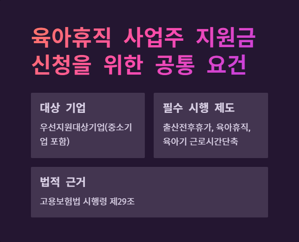 모든 육아휴직 사업주 지원금에 공통적으로 적용되는 요건들이 있습니다. 이 요건들을 충족하지 못하면 지원금 신청 자체가 불가능하므로, 사전에 반드시 확인해야 합니다.