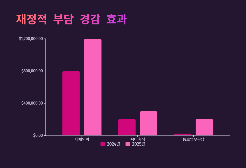 - 대체인력 고용 비용 지원: 육아휴직으로 인한 업무 공백을 메우기 위해 새로운 인력을 고용할 때 발생하는 인건비 부담을 줄여줍니다. 2025년부터 월 최대 120만 원까지 인상된 대체인력 지원금은 기업이 우수한 대체인력을 확보하는 데 큰 도움이 됩니다.