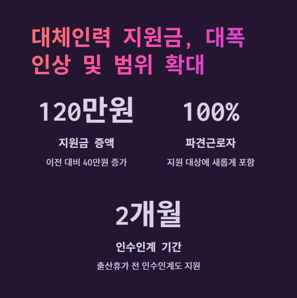 - 지원금액: 대체인력 1명당 월 최대 120만 원 (종전 월 80만 원에서 인상)