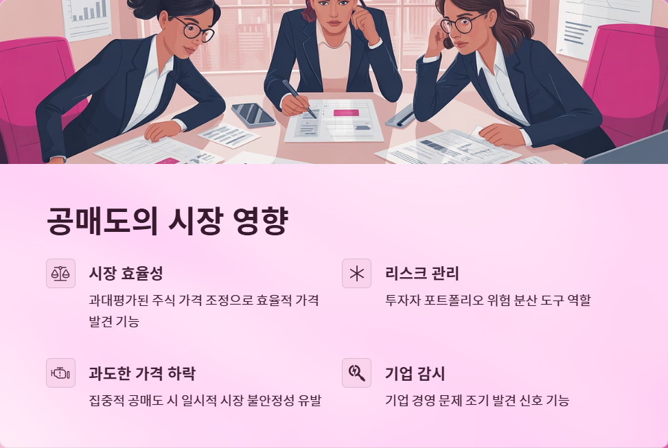 - 시장 효율성 제고: 공매도는 주식 시장의 과열을 막고, 기업의 과대평가된 주가를 조정하는 역할을 합니다. 기업의 실적이나 가치에 비해 주가가 비정상적으로 높게 형성되어 있을 경우, 공매도 세력이 개입하여 주가를 현실적인 수준으로 되돌리는 데 기여할 수 있습니다. 이는 시장의 정보 비대칭을 줄이고 효율적인 가격 발견에 도움이 됩니다.