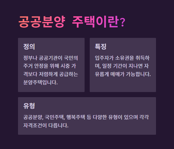 이러한 다양한 유형의 공공분양 주택은 정부의 주거 복지 정책의 일환으로, 특히 무주택 서민층의 내 집 마련 기회를 확대하는 데 기여하고 있습니다.