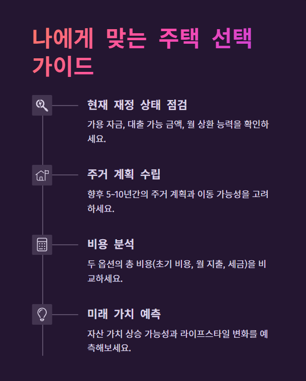 - 자산 증식보다는 유동성 확보나 다른 투자에 관심이 있는 경우: 주택 소유보다는 절감된 주거비로 다른 금융 자산에 투자하거나 사업 자금 등으로 활용하고 싶은 분들에게 유리합니다.