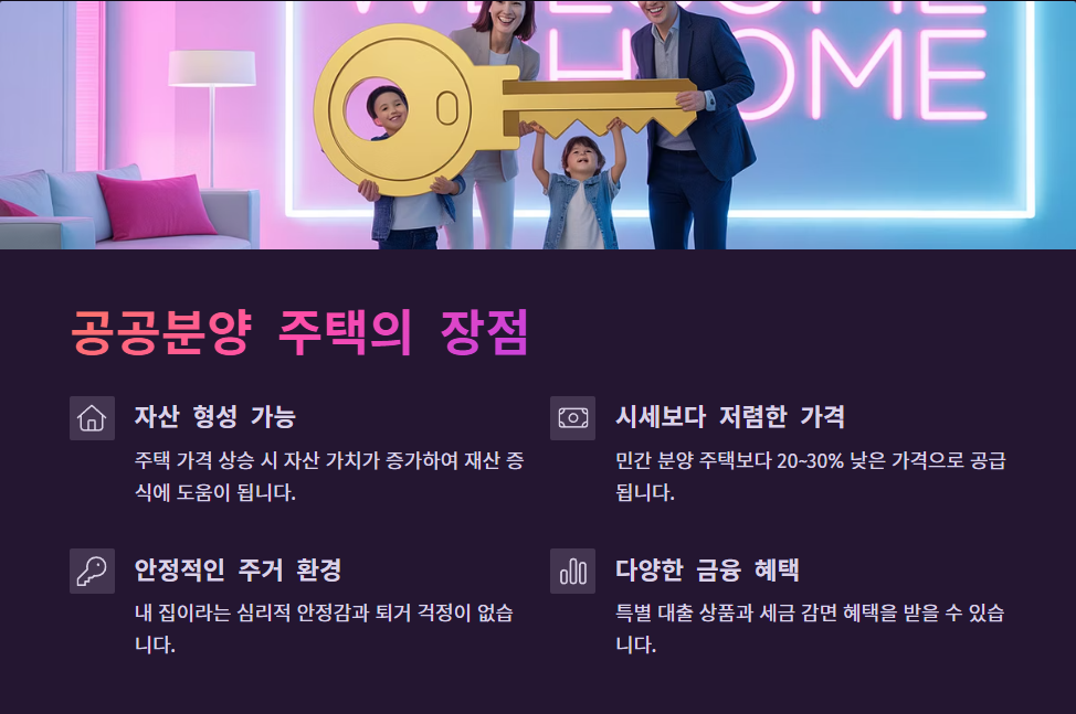 - 안정적인 주거 환경: 공공기관이 공급하므로 안정적인 주거 환경과 체계적인 관리를 기대할 수 있습니다.