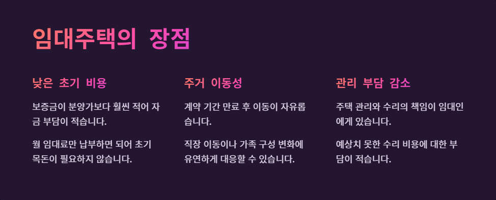 | 초기 비용 | 분양대금 (계약금, 중도금, 잔금) 발생 | 보증금 및 월 임대료 발생 (상대적으로 저렴) |