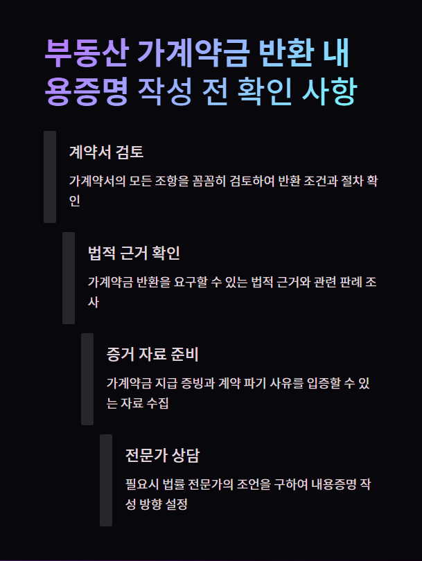 부동산 가계약금 반환 내용증명을 발송하기 전에 몇 가지 중요한 사항들을 반드시 확인해야 합니다. 이는 내용증명의 효과를 극대화하고, 향후 발생할 수 있는 법적 분쟁에서 유리한 위치를 점하기 위함입니다.