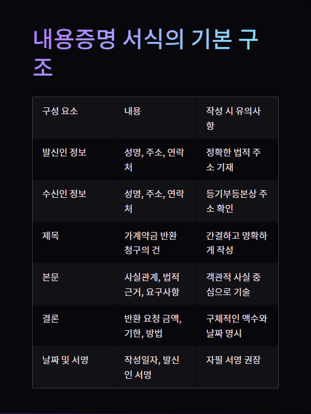 부동산 가계약금 반환 내용증명은 일반적으로 다음과 같은 기본 구조를 가집니다.