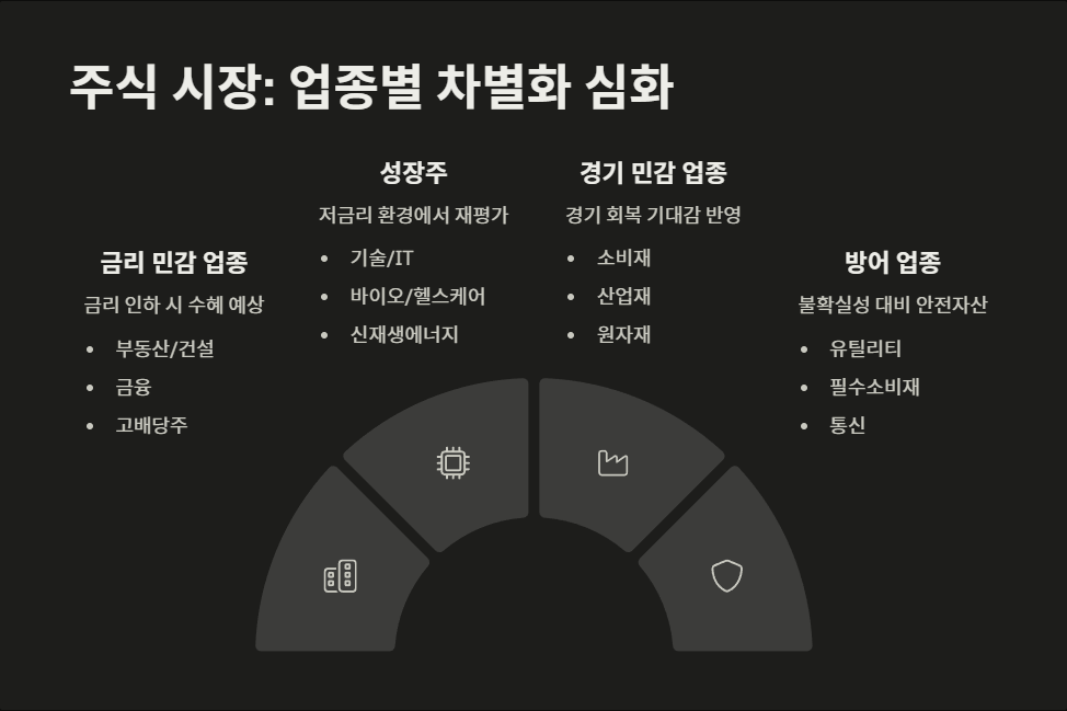 미국 기준금리 변화는 주식 시장에 큰 영향을 미치며, 특히 성장주와 가치주, 그리고 업종별로 차별화된 움직임을 보일 수 있습니다.