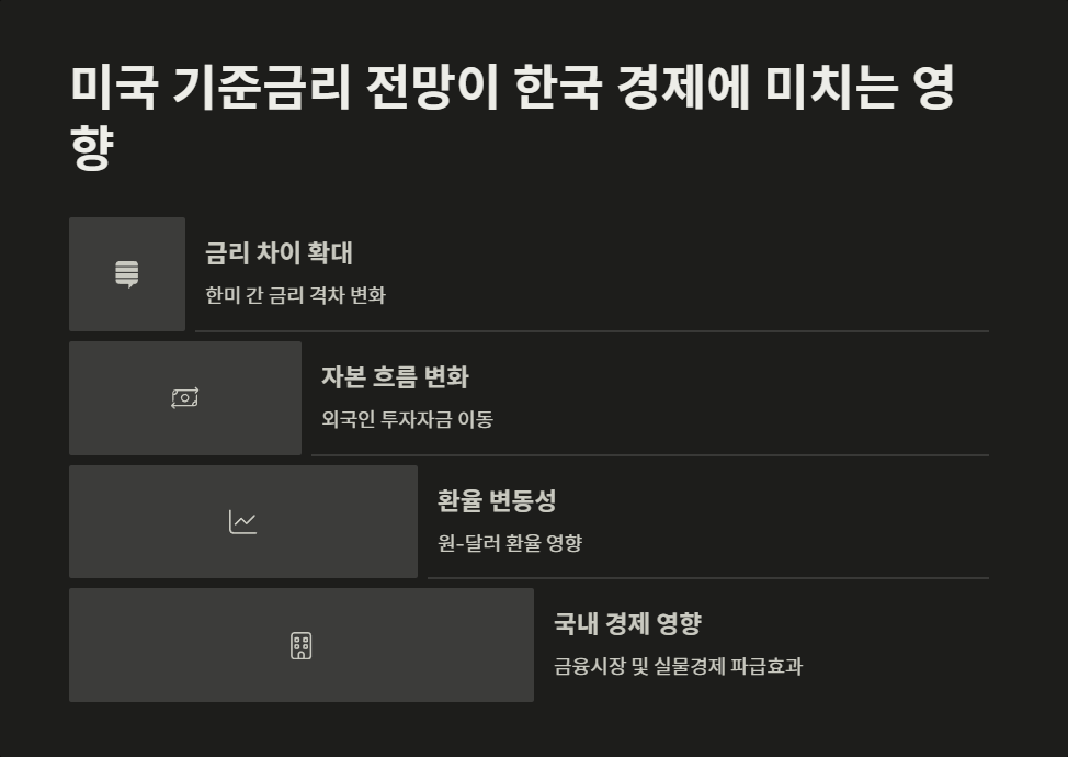미국 기준금리 전망은 한국 경제에 지대한 영향을 미칩니다. 미국과 한국의 금리차는 외국인 자본 유출입, 환율, 그리고 국내 금리 결정에 직접적인 영향을 미치기 때문입니다.